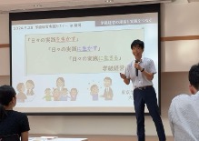 学級経営の実践と研究の関わりの視点として、事務局の上條より「学級経営実践研究モデル」について提示し、実践と研究の関係を参加者で共有しました。